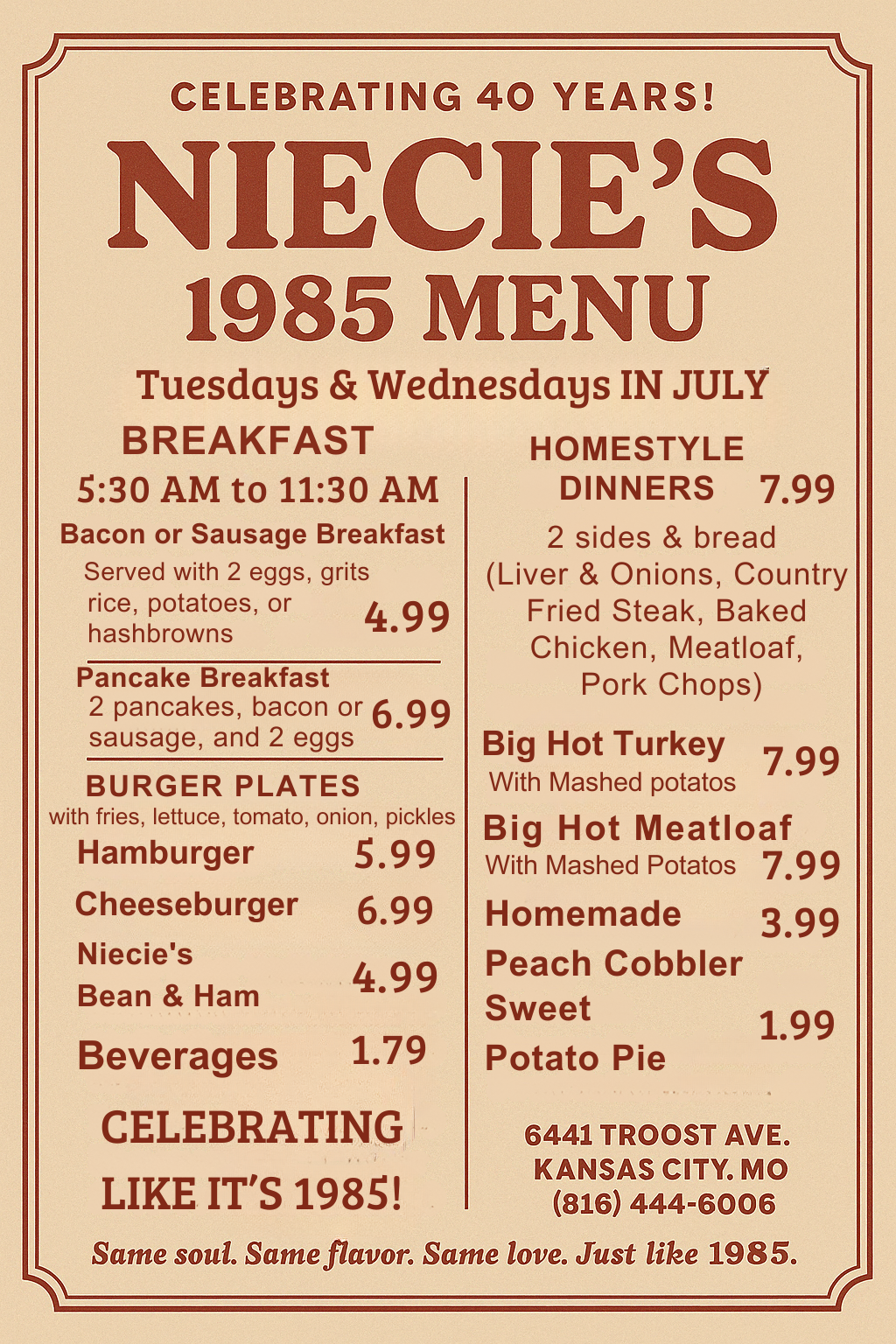 This is our way of saying thank you, Kansas City for 40 amazing years of love and support. Weโre rolling back the prices to 1985 โ same soul, same flavor, same love ๐